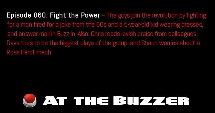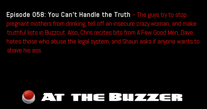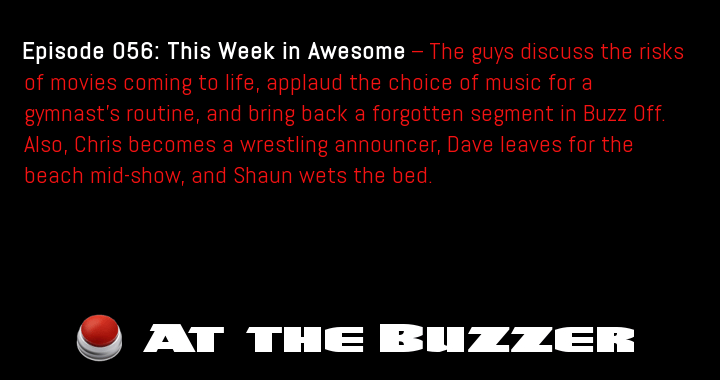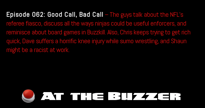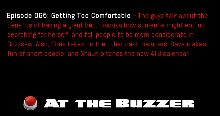 Episode 65: Getting Too Comfortable — The guys talk about the benefits of having a giant bed, discuss how someone might end up searching for herself, and tell people to be more considerate in Buzzsaw. Also, Chris takes on the … Continue reading At the Buzzer (10/18/12)