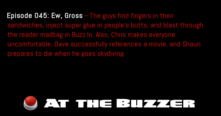 Episode 45: Ew, Gross — The guys find fingers in their sandwiches, inject super glue in people’s butts, and blast through the reader mailbag in Buzz In. Also, Chris makes everyone uncomfortable, Dave successfully references a movie, and Shaun prepares … Continue reading At the Buzzer (05/31/12)