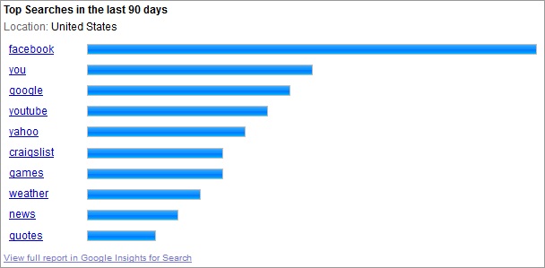 So it got me thinking: What does Google like? They’ve recently made looking that information up easier with Google Trends and Google Insights, both of which pull back the curtain on what really clicks with web users. They run information back to 2004, and I decided to take a look at the 10 most searched keywords on Google in the United states since those stats were tracked. The top 10 isn’t exactly full of surprises, but a couple items are not quite what you’d expect.